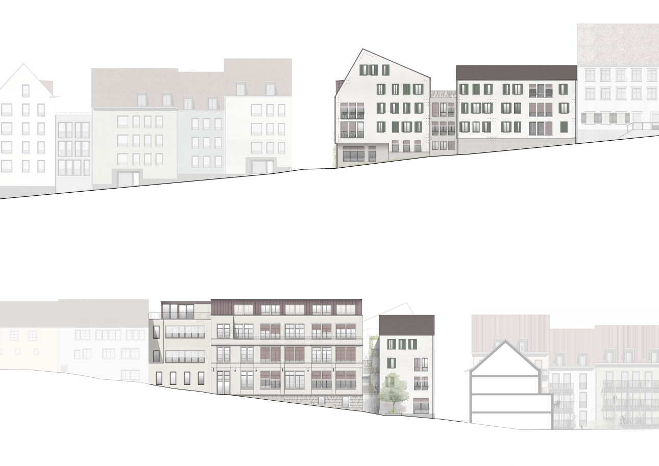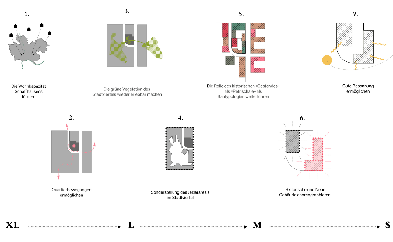 Dank seiner Lage im dicht bebauten historischen Kontext der Schaffhauser Altstadt und in Nachbarschaft zum ehemaligen Industriequartier am Rhein stellt das Jezler Areal seit jeher eine "Petrischale" unterschiedlicher Bautypologien und Nutzungen dar. Die Geschichte dient als Inspiration für ein neuartiges Konzept des zeitgenössischen urbanen Wohnens. Der Entwurf fügt sich nahtlos in die Dachlandschaft der Altstadt ein und bietet gleichzeitig eine zeitgemässe Architektur, die den Bewohnern viel Platz, Licht und die Wahl zwischen Privatsphäre und gemeinschaftlichem Wohnen bietet. Im historischen Jezler-Gebäude entstehen Loft-Wohneinheiten. Im Neubau sind die Wohneinheiten so ausgerichtet, dass sie ein Maximum an Sonnenlicht erhalten und über hybride Innen-/Aussenräume verfügen, die variabel genutzt werden können. Gemeinsame Dachterrassen, Co-Living-Spaces und flexibel nutzbare Ateliers stehen den Bewohnern zur Verfügung und sind über den begrünten Innenhof miteinander verbunden. Der urbane Charakter des Projekts zieht sich durch: es ist autofrei und im Erdgeschoss für das Publikum zugänglich.