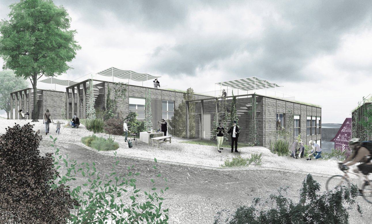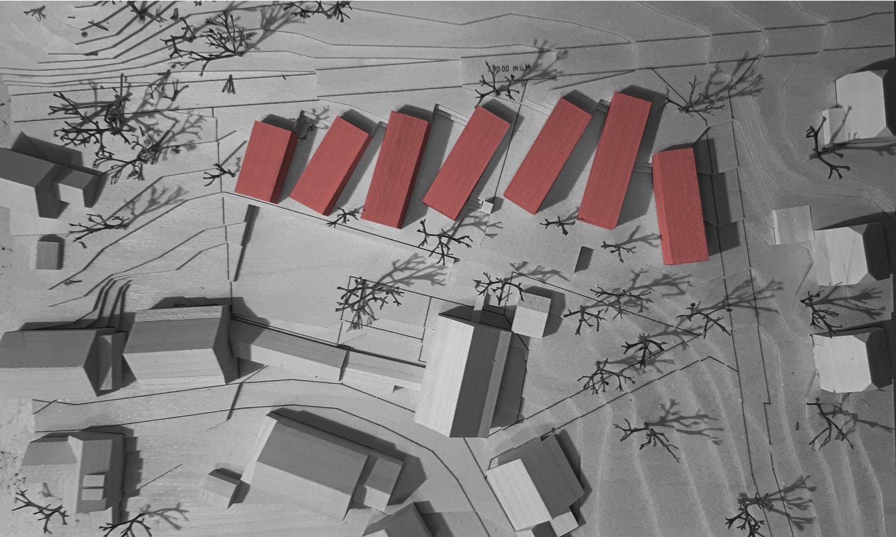 Im Dorf Hofen, im nördlichsten Teil von Thayngen, wird auf Basis eines Quartierplans ein neues Wohnprojekt entwickelt. An einem sanften Hang neben dem historischen Dorfkern gelegen, bietet die neue Wohnsiedlung eine Alternative zur altherkömmlichen Einfamilienhausstruktur. Das erarbeitete Richtprojekt schlägt sieben längliche Volumen mit zwei Wohngeschossen und Dachterrasse vor. Der Bezug zur umliegenden Landschaft und die Ausblicke ins Bibertal werden durch Freiräume und Sichtachsen betont