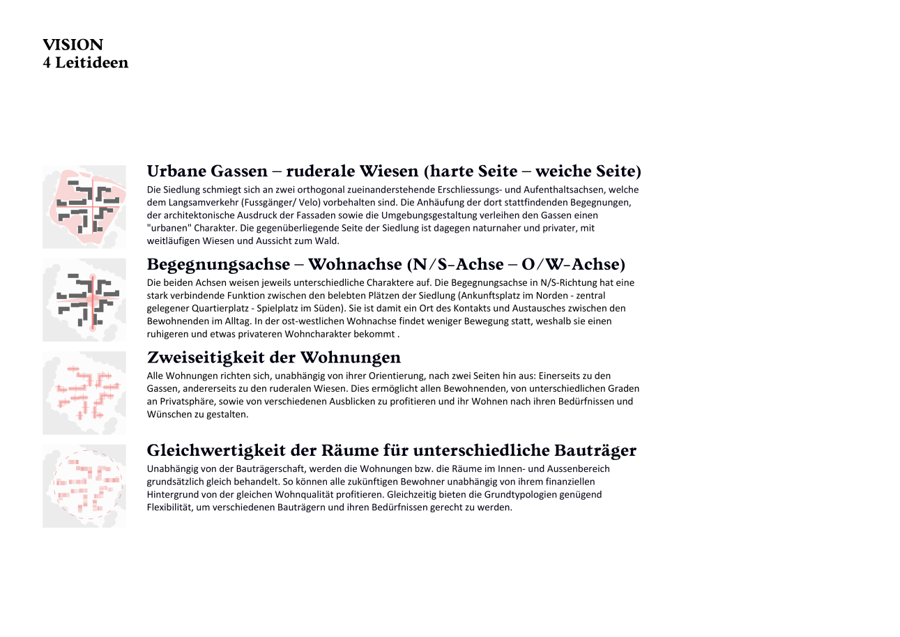Das Freiraumkonzept sieht eine oberirdisch autofreie Siedlung vor und orientiert sich an den beiden Erschliessungsachsen in Nord-Süd- bzw. Ost-West-Richtung und inszeniert die generierte Zweiseitigkeit: Eine urban gestaltete Gassenseite steht einer naturnahen Wiesen-&Waldseite gegenüber. Das Konzept der Zweiseitigkeit wird in der Grundrissgestaltung fortgesetzt, sodass jede Wohnung von beiden Qualitäten profitieren kann.
