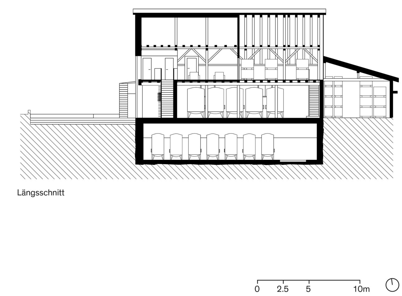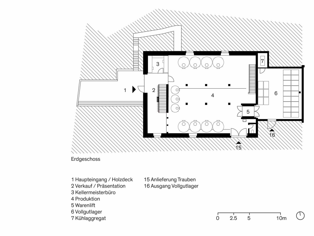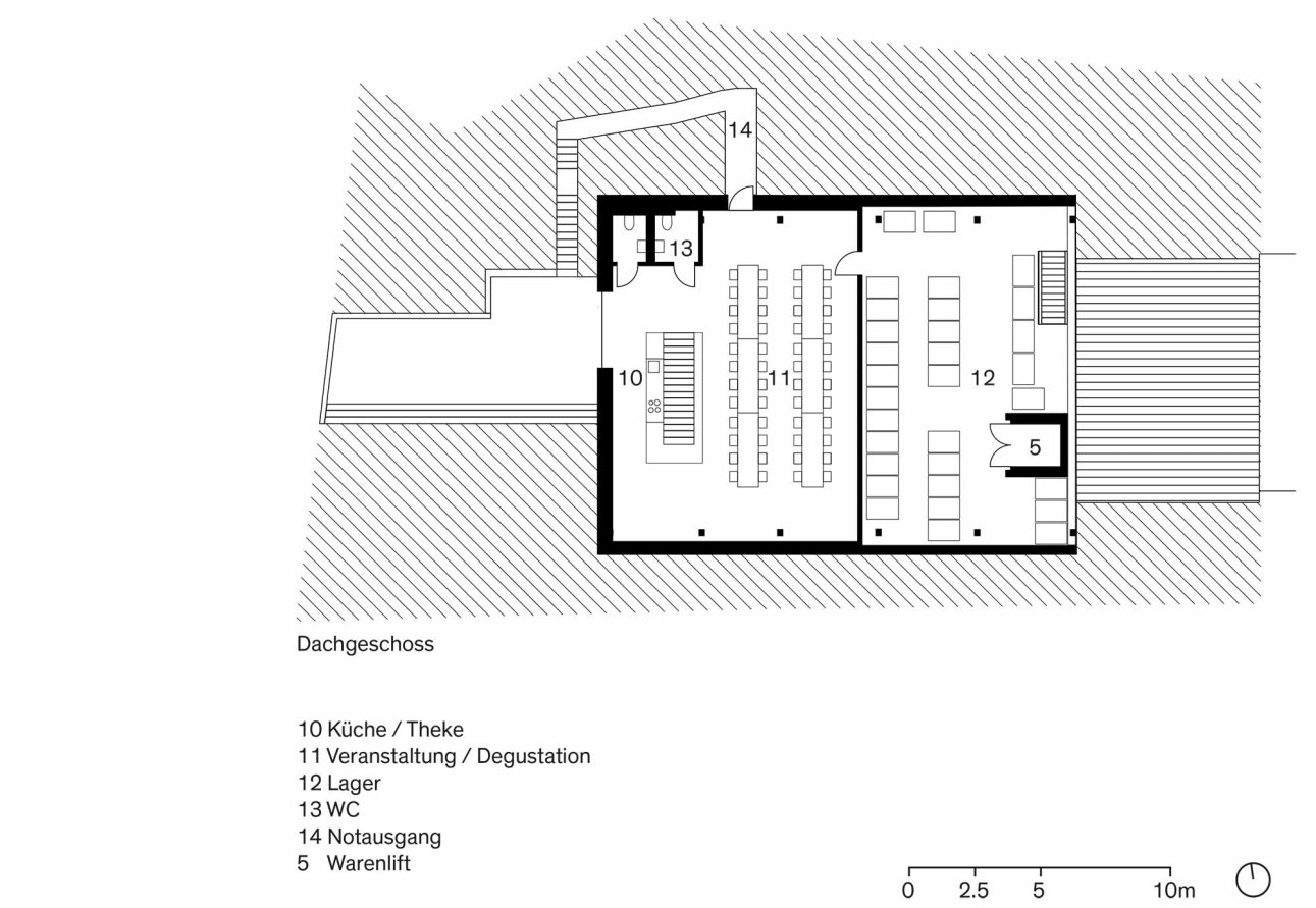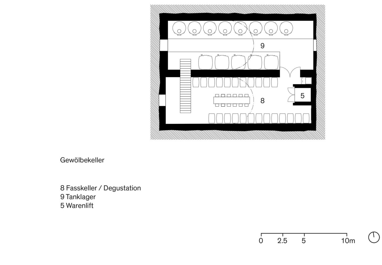 Durch das Bekenntnis zum Wert der historischen Trotte hat man sich für einen Umbau anstelle des Anbaus entschieden. Der Produktionsprozess wird analysiert und vom neuen Geschäftsführer und „Winemaker“ Michael Kaben neu gedacht. In die Infrastruktur – neue Tanks, neue Abbeermaschine, neue Geräte – wird investiert und die Produktequalität damit gesteigert. Darin wird die Chance gesehen, diese neuen Werte durch das Öffnen der vorherig introvertierten Situation zu inszenieren und Teil des Kundenerlebnisses werden zu lassen. Neben der Instandstellung der Substanz wird die Nutzung der gesamten Liegenschaft so optimiert, dass das Raumprogramm in dem bestehenden Volumen umgesetzt werden kann. Das Dachgeschoss, vorher als Lager genutzt, wird neu organisiert und damit Platz für einen Veranstaltungsraum unter dem beeindruckenden Dachstuhl geschaffen.