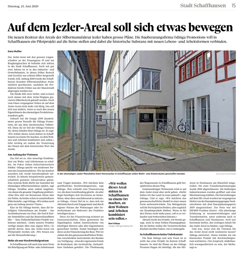 Lesen Sie mehr über die Pläne der neuen Besitzer des Jezler-Arela, in dem Zeitungsartikel der Schaffhauser Nachrichten vom 23. Juni 2020.