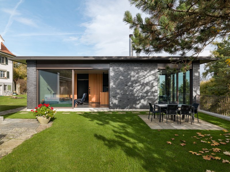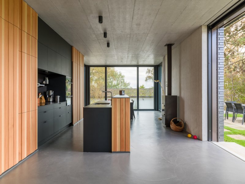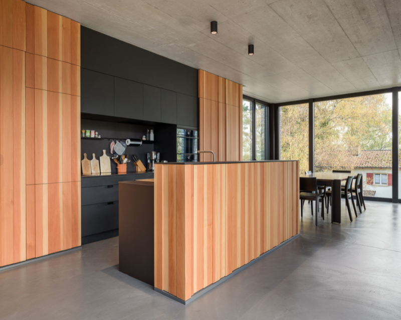 Die Wipf Schreinerei AG in Schaffhausen hat die Küche in Zusammenarbeit mit uns entworfen und gebaut. Es wurde darauf geachtet, dass die Küche nicht nur ins Gebäude integriert wird, sondern mit der Gebäudearchitektur verschmilzt. Zudem wurde explizit auf das Material Douglasie gesetzt, um die Massivität des Gebäudes zu brechen.