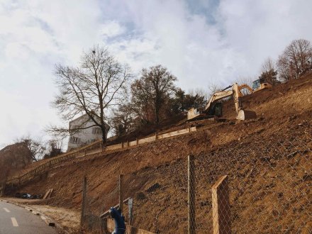 Auf der einen Seite öffnet sich der Blick ins Tal, auf der anderen begleitet der bewaldete Hang das Haus. Topografie und Aussicht wurden zu prägenden Parametern für eine polygonale Gebäudekubatur.