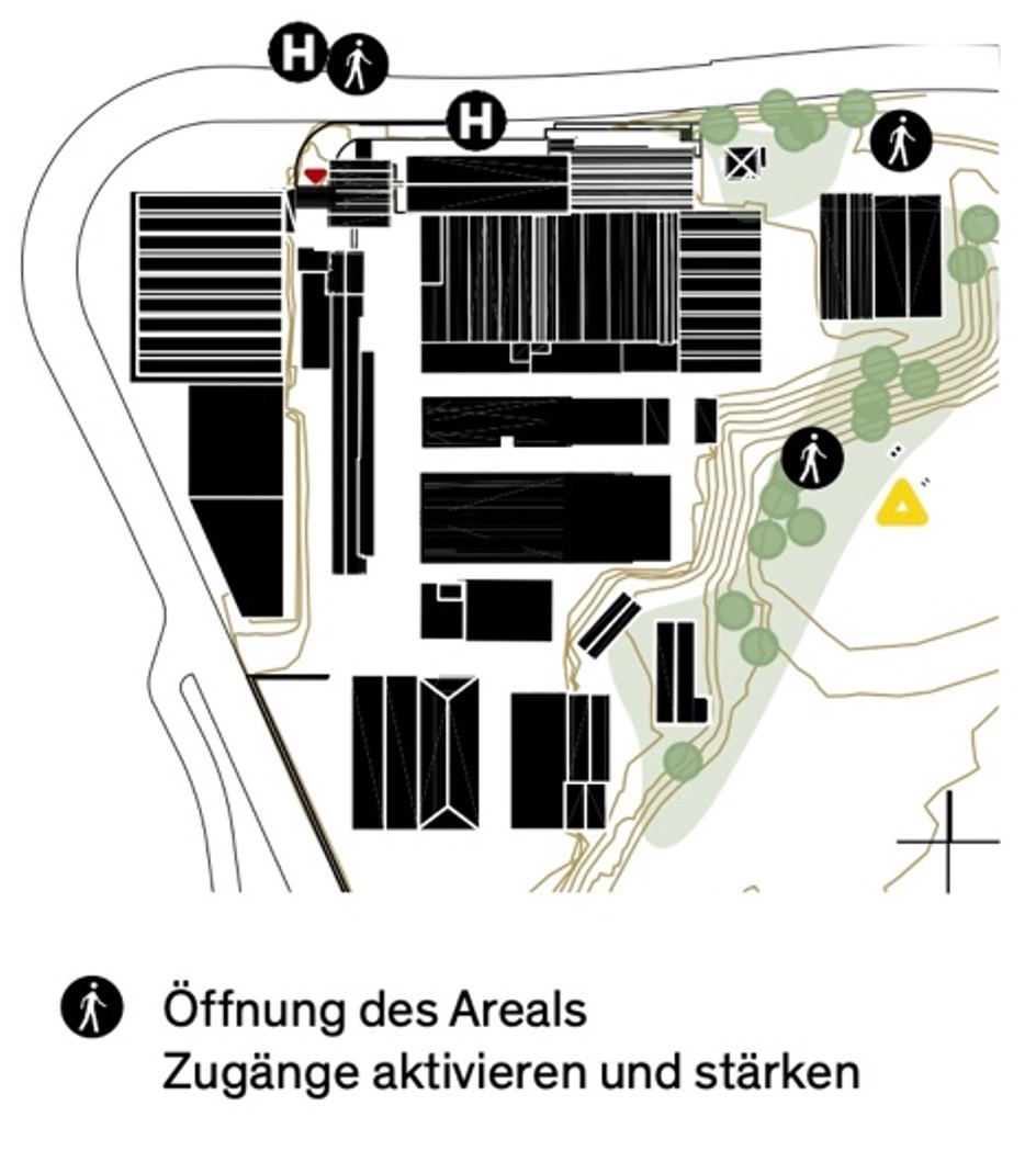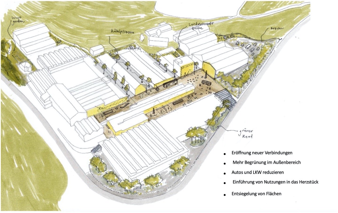 Aus dem heutigen Gewerbeareal soll ein multifunktionaler, lebendiger Ort mit einer eigenen, profilierten Identität entstehen, welcher für die Geschäftsmietenden, deren Mitarbeitende, ihren KundInnen und Besuchenden einen Mehrwert bietet, und in seiner Atmosphäre für mögliche künftige BewohnerInnen ein unvergleichbarer, attraktiver Lebensraum darstellt.