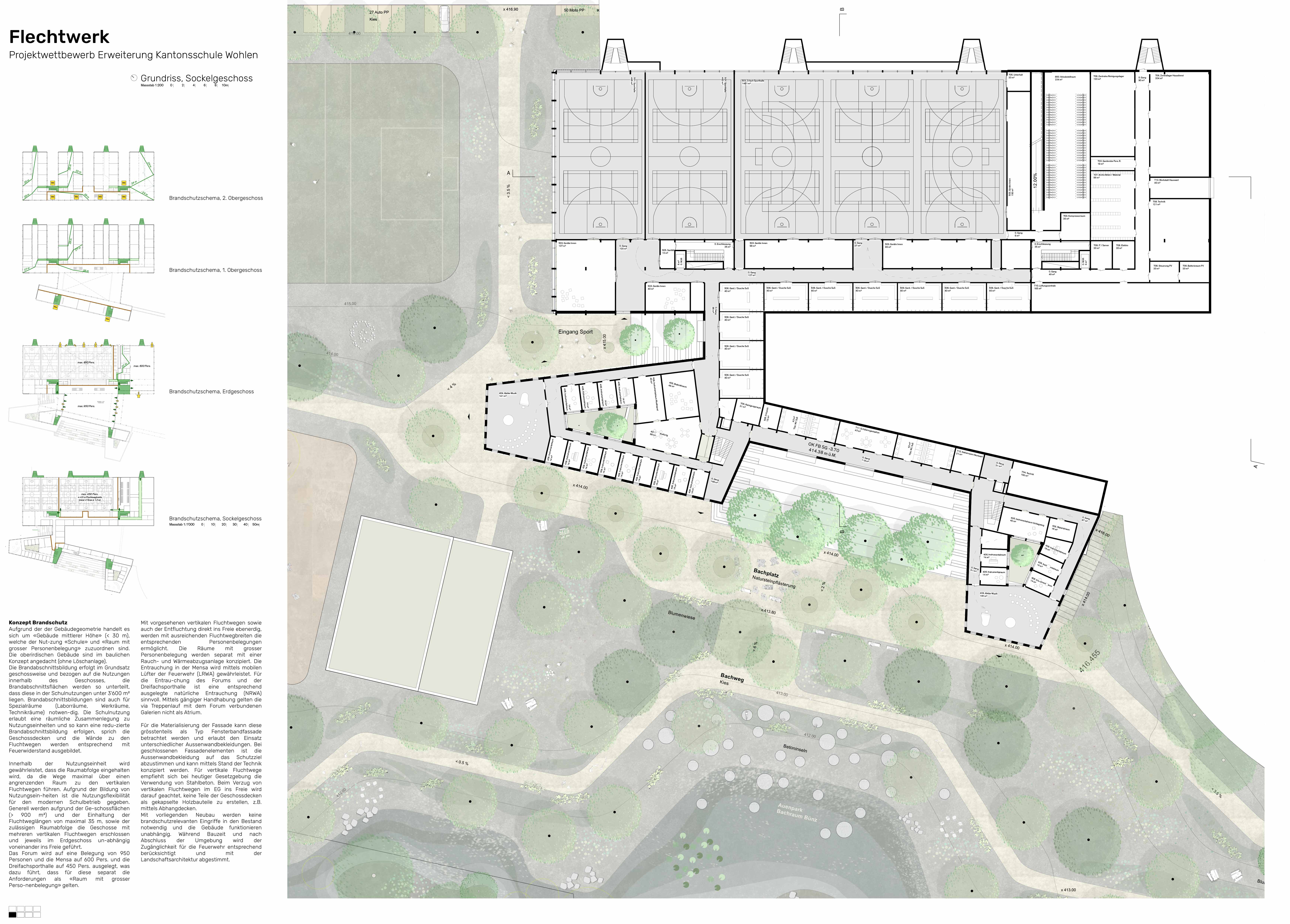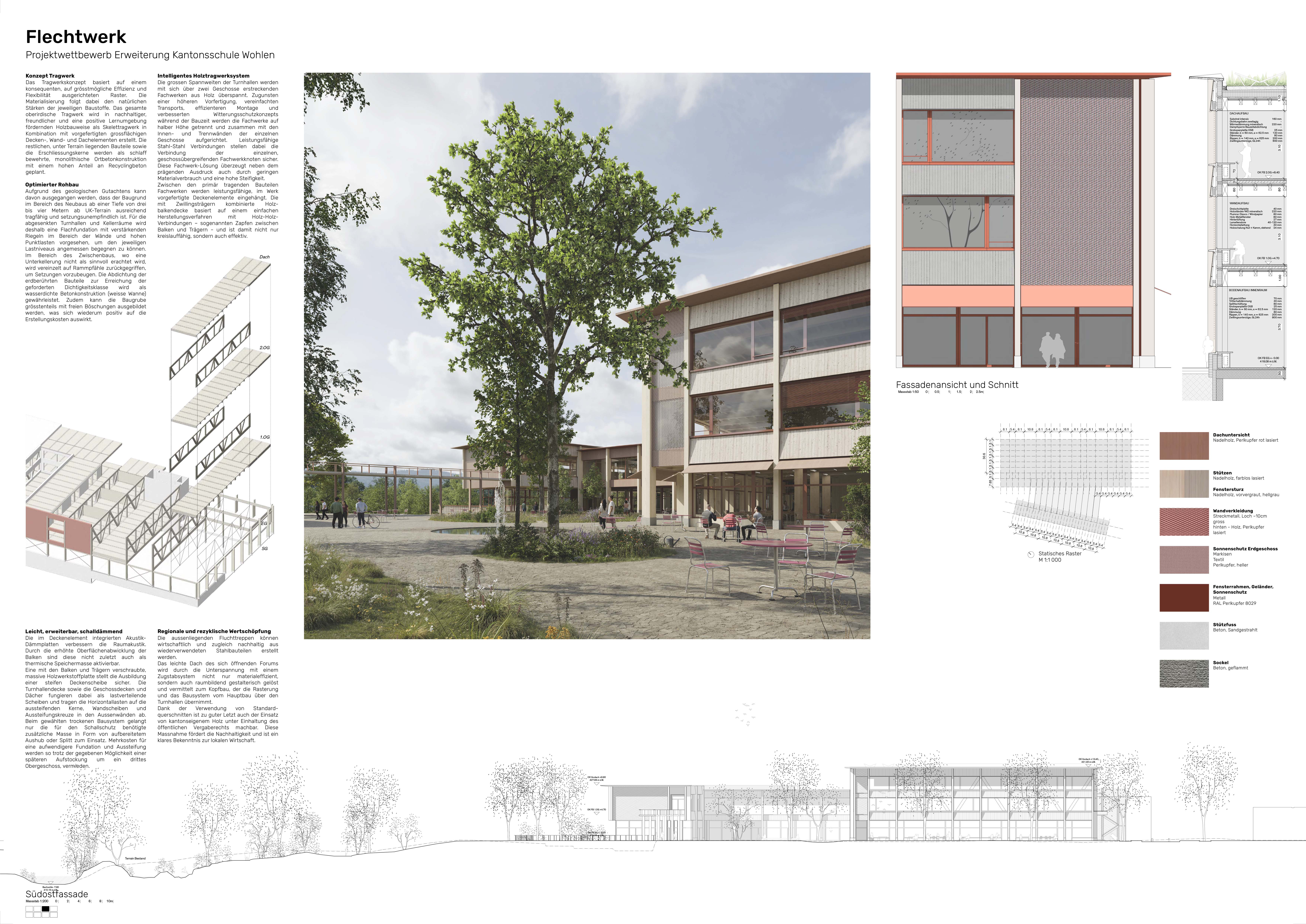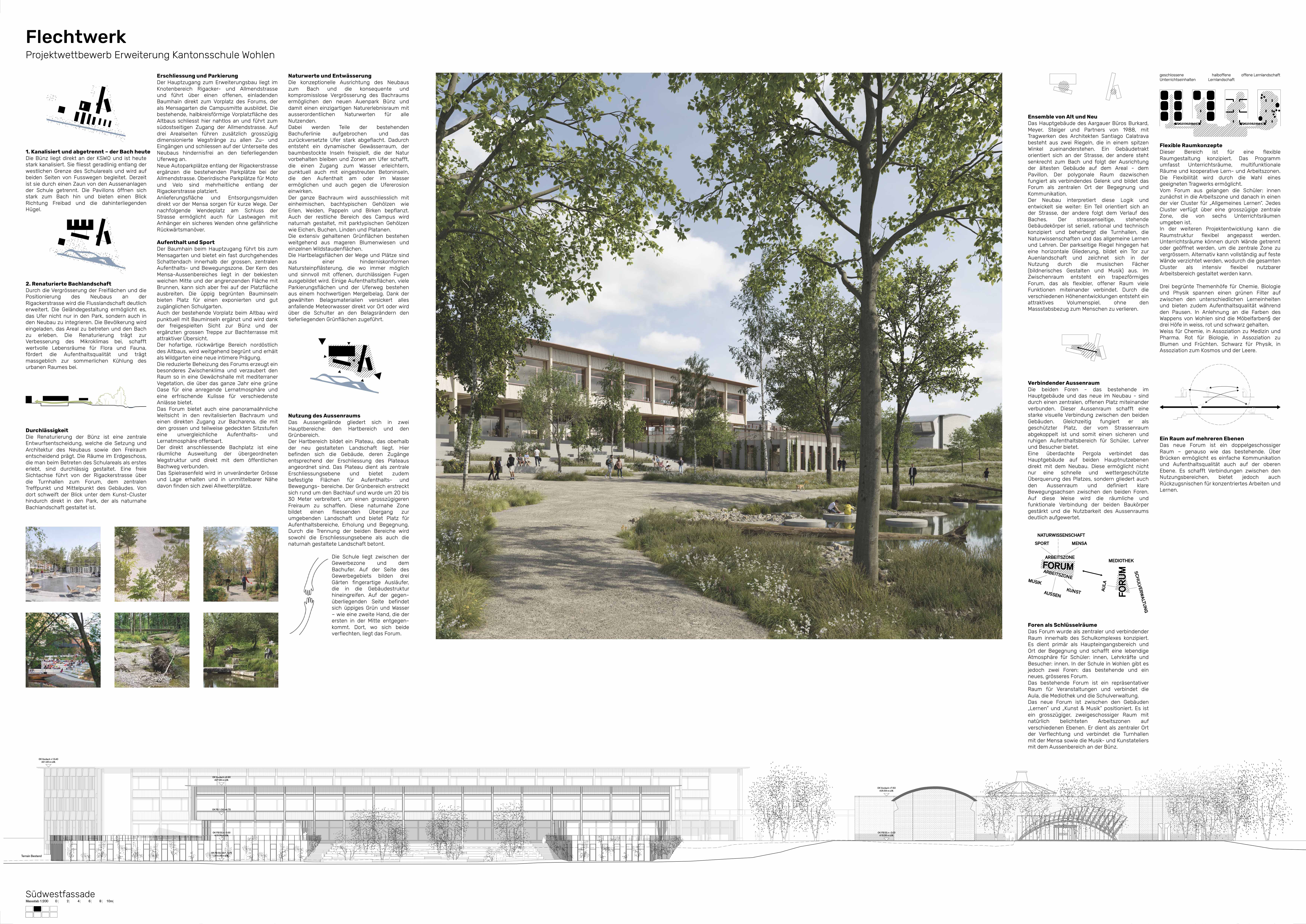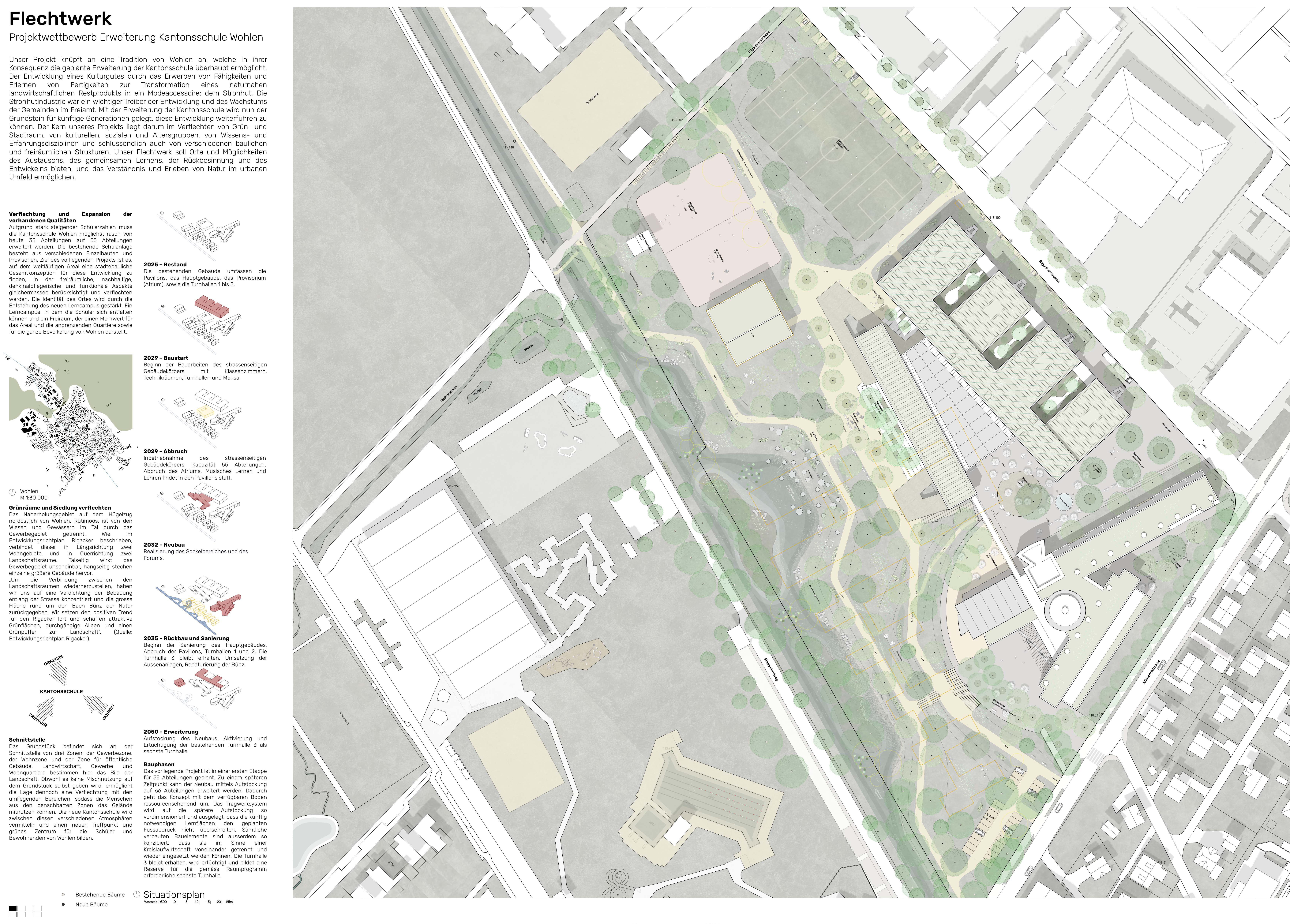 Das Projekt knüpft an eine Tradition von Wohlen an, welche in ihrer Konsequenz die geplante Erweiterung der Kantonsschule überhaupt ermöglicht. Der Entwicklung eines Kulturgutes durch das Erwerben von Fähigkeiten und Erlernen von Fertigkeiten zur Transformation eines naturnahen landwirtschaftlichen Restprodukts in ein Modeaccessoire: dem Strohhut. Die Strohhutindustrie war ein wichtiger Treiber der Entwicklung und des Wachstums der Gemeinden im Freiamt. Mit der Erweiterung der Kantonsschule wird nun der Grundstein für künftige Generationen gelegt, diese Entwicklung weiterführen zu können. Der Kern unseres Projekts liegt darum im Verflechten von Grün- und Stadtraum, von kulturellen, sozialen und Altersgruppen, von Wissens- und Erfahrungsdisziplinen und schlussendlich auch von verschiedenen baulichen und freiräumlichen Strukturen. Unser Flechtwerk soll Orte und Möglichkeiten des Austauschs, des gemeinsamen Lernens, der Rückbesinnung und des Entwickelns bieten, und das Verständnis und Erleben von Natur im urbanen Umfeld ermöglichen.