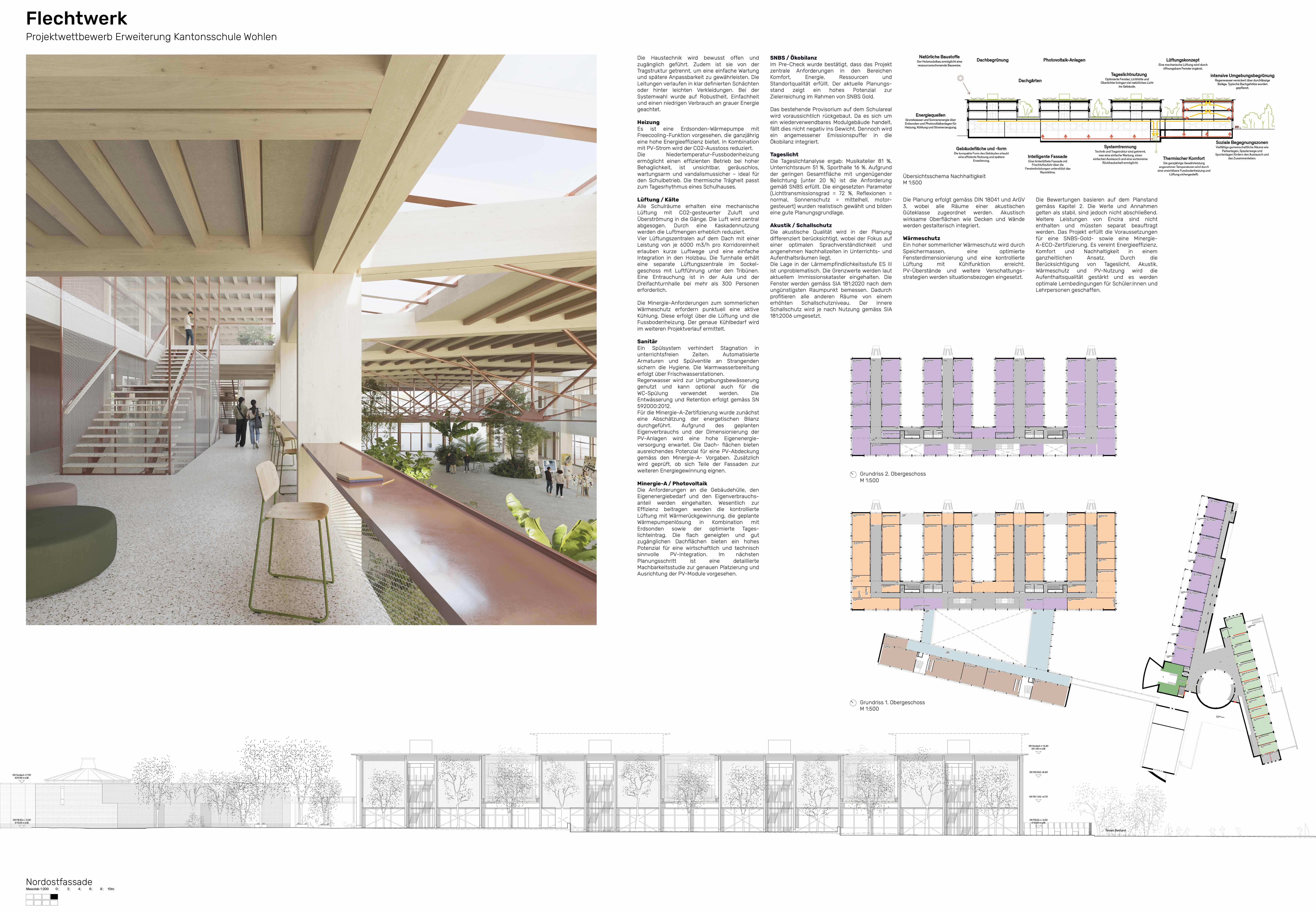 Die grossen Spannweiten der Turnhallen werden mit sich über zwei Geschosse erstreckenden Fachwerken aus Holz überspannt. Zugunsten einer höheren Vorfertigung, vereinfachten Transports, effizienteren Montage und verbesserten Witterungsschutzkonzepts während der Bauzeit werden die Fachwerke auf halber Höhe getrennt und zusammen mit den Innen- und Trennwänden der einzelnen Geschosse aufgerichtet. Leistungsfähige Stahl-Stahl Verbindungen stellen dabei die Verbindung der einzelnen, geschossübergreifenden Fachwerkknoten sicher. Diese Fachwerk-Lösung überzeugt neben dem prägenden Ausdruck auch durch geringen Materialverbrauch und eine hohe Steifigkeit. Zwischen den primär tragenden Bauteilen Fachwerken werden leistungsfähige, im Werk vorgefertigte Deckenelemente eingehängt. Die mit Zwillingsträgern kombinierte Holzbalkendecke basiert auf einem einfachen Herstellungsverfahren mit Holz-Holz-Verbindungen – sogenannten Zapfen zwischen Balken und Trägern - und ist damit nicht nur kreislauffähig, sondern auch effektiv. Leicht, erweiterbar, schalldämmend. Die im Deckenelement integrierten Akustik- Dämmplatten verbessern die Raumakustik. Durch die erhöhte Oberflächenabwicklung der Balken sind diese nicht zuletzt auch als thermische Speichermasse aktivierbar. Eine mit den Balken und Trägern verschraubte, massive Holzwerkstoffplatte stellt die Ausbildung einer steifen Deckenscheibe sicher. Die Turnhallendecke sowie die Geschossdecken und Dächer fungieren dabei als lastverteilende Scheiben und tragen die Horizontallasten auf die aussteifenden Kerne, Wandscheiben und Aussteifungskreuze in den Aussenwänden ab. Beim gewählten trockenen Bausystem gelangt nur die für den Schallschutz benötigte zusätzliche Masse in Form von aufbereitetem Aushub oder Splitt zum Einsatz. Mehrkosten für eine aufwendigere Fundation und Aussteifung werden so trotz der gegebenen Möglichkeit einer späteren Aufstockung um ein drittes Obergeschoss, vermieden. Regionale und rezyklische Wertschöpfung. Die aussenliegenden Fluchttreppen können wirtschaftlich und zugleich nachhaltig aus wiederverwendeten Stahlbauteilen erstellt werden. Das leichte Dach des sich öffnenden Forums wird durch die Unterspannung mit einem Zugstabsystem nicht nur materialeffizient, sondern auch raumbildend gestalterisch gelöst und vermittelt zum Kopfbau, der die Rasterung und das Bausystem vom Hauptbau über den Turnhallen übernimmt. Dank der Verwendung von Standardquerschnitten ist zu guter Letzt auch der Einsatz von kantonseigenem Holz unter Einhaltung des öffentlichen Vergaberechts machbar. Diese Massnahme fördert die Nachhaltigkeit und ist ein klares Bekenntnis zur lokalen Wirtschaft.