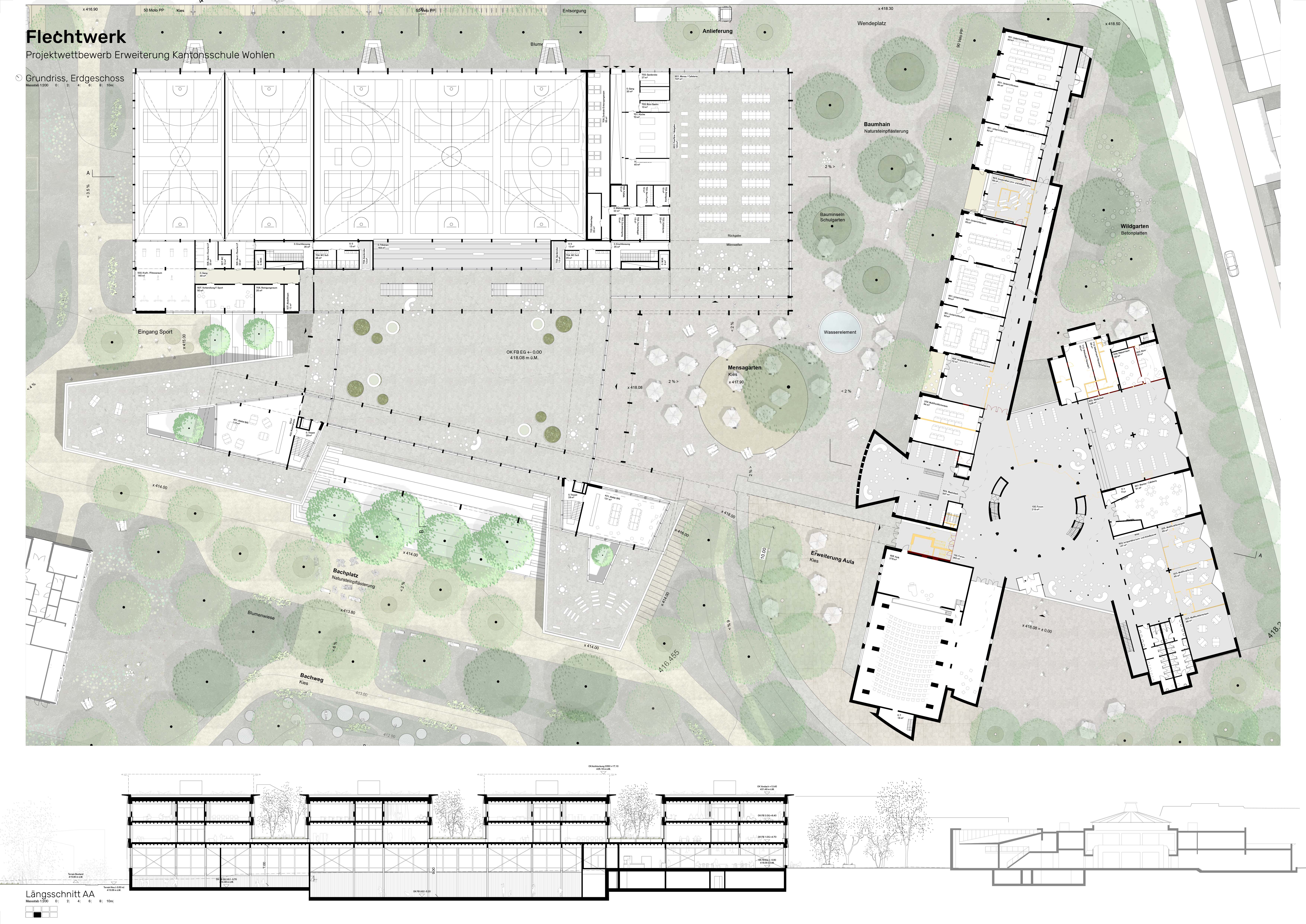 Der Baumhain beim Hauptzugang führt bis zum Mensagarten und bietet ein fast durchgehendes Schattendach innerhalb der grossen, zentralen Aufenthalts- und Bewegungszone. Der Kern des Mensa-Aussenbereiches liegt in der bekiesten weichen Mitte und der angrenzenden Fläche mit Brunnen, kann sich aber frei auf der Platzfläche ausbreiten. Die üppig begrünten Bauminseln bieten Platz für einen gut zugänglichen Schulgarten. Auch der bestehende Vorplatz beim Bestandesbau wird punktuell mit Bauminseln ergänzt und dank der freigespielten Sicht zur Bünz und der ergänzten grossen Treppe zur Bachterrasse mit attraktiver Übersicht. Der hofartige, rückwärtige Bereich nordöstlich des Bestandesbaus wird weitgehend begrünt und erhält als Wildgarten eine neue intimere Prägung. Die reduzierte Beheizung des Forums erzeugt ein besonderes Zwischenklima und verzaubert den Raum in eine Gewächshalle mit mediterraner Vegetation, die über das ganze Jahr eine grüne Oase für eine anregende Lernatmosphäre und eine erfrischende Kulisse für verschiedenste Anlässe bietet. Das Forum ermöglicht auch eine panoramaähnliche Weitsicht in den revitalisierten Bachraum und einen direkten Zugang zur Bacharena, die mit den grossen und teilweise gedeckten Sitzstufen eine unvergleichliche Aufenthalts- und Lernatmosphäre offenbart. Der direkt anschliessende Bachplatz ist eine räumliche Ausweitung der übergeordneten Wegstruktur und direkt mit dem öffentlichen Bachweg verbunden. Das Rasenspielfeld wird in unveränderter Grösse und Lage erhalten und in unmittelbarer Nähe davon finden sich zwei Allwetterplätze.