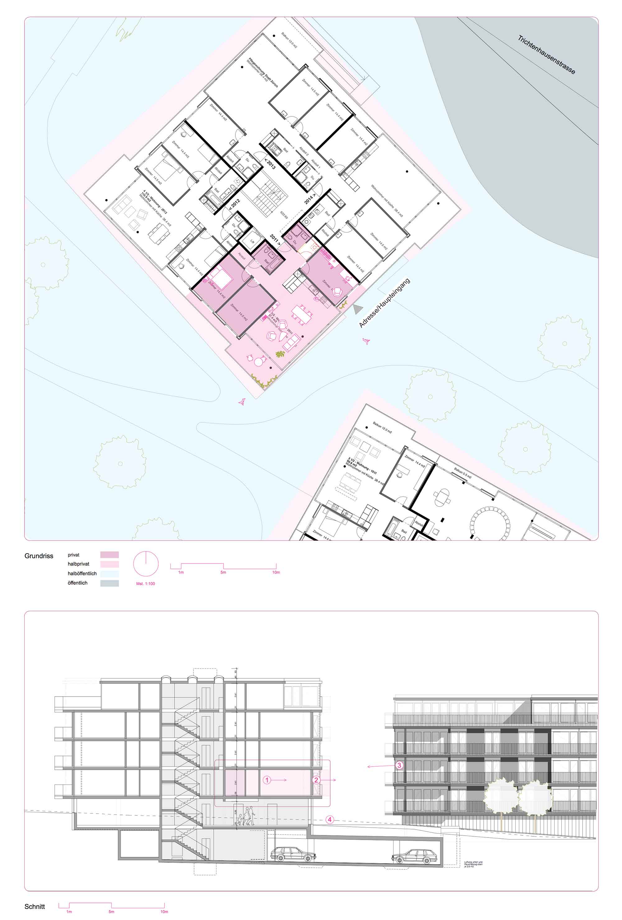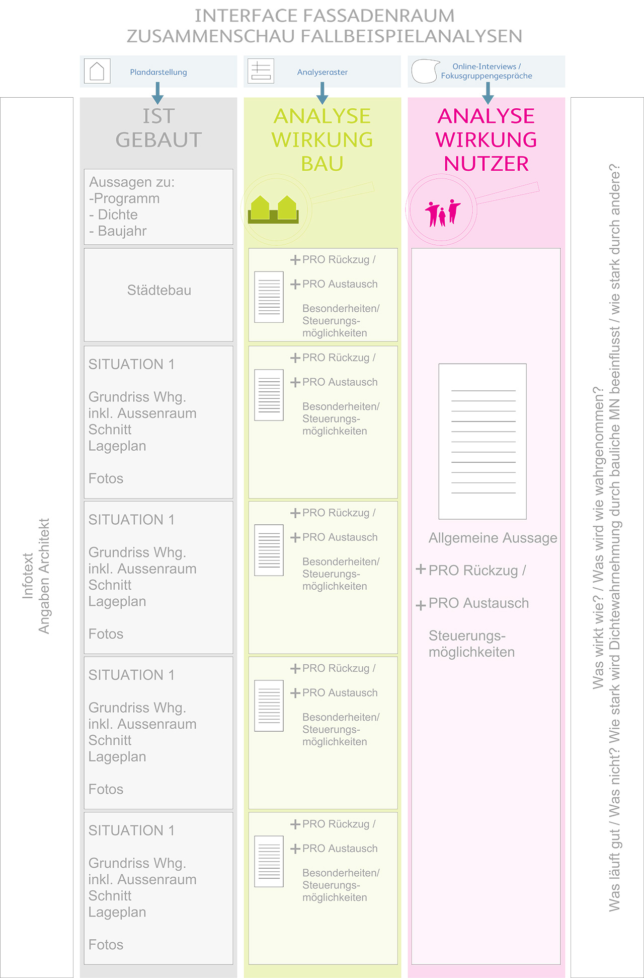 Aus der Architekturpsychologie ist bekannt, dass die individuelle Regulierung von Austausch und Rückzug zum Wohlbefinden der Bewohnenden beiträgt und ein Enge-Empfinden vermieden wird. Im Bereich des Fassadenraumes, wo die private und die öffentliche Sphäre direkt aufeinandertreffen, liegt ein grosses Potenzial zur Regulierung von Austausch und Rückzug. In dem Projekt „Interface Fassadenraum“ wurden deshalb Planungsempfehlungen zur Gestaltung und Förderung von „erweiterten Fassadenräumen“ erarbeitet.