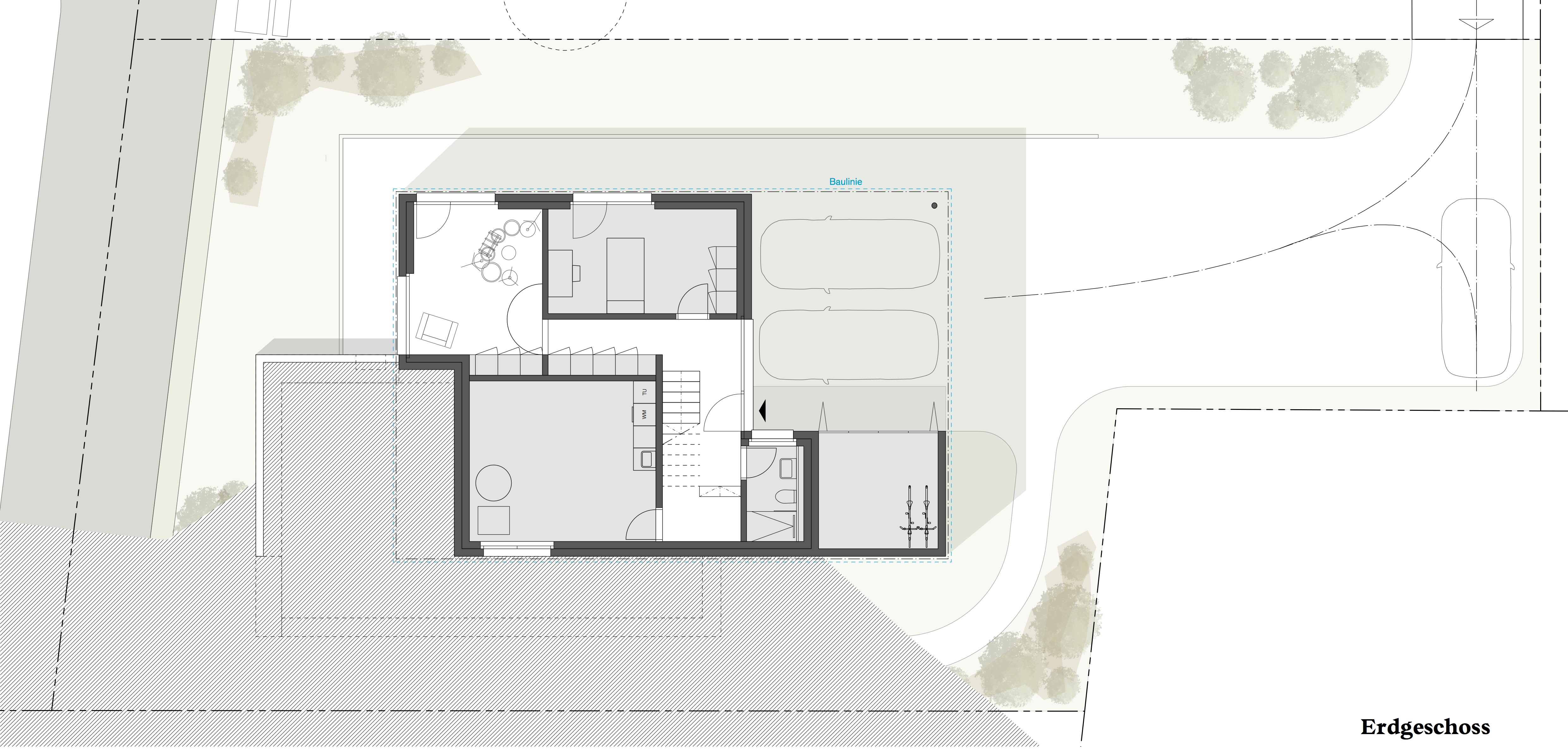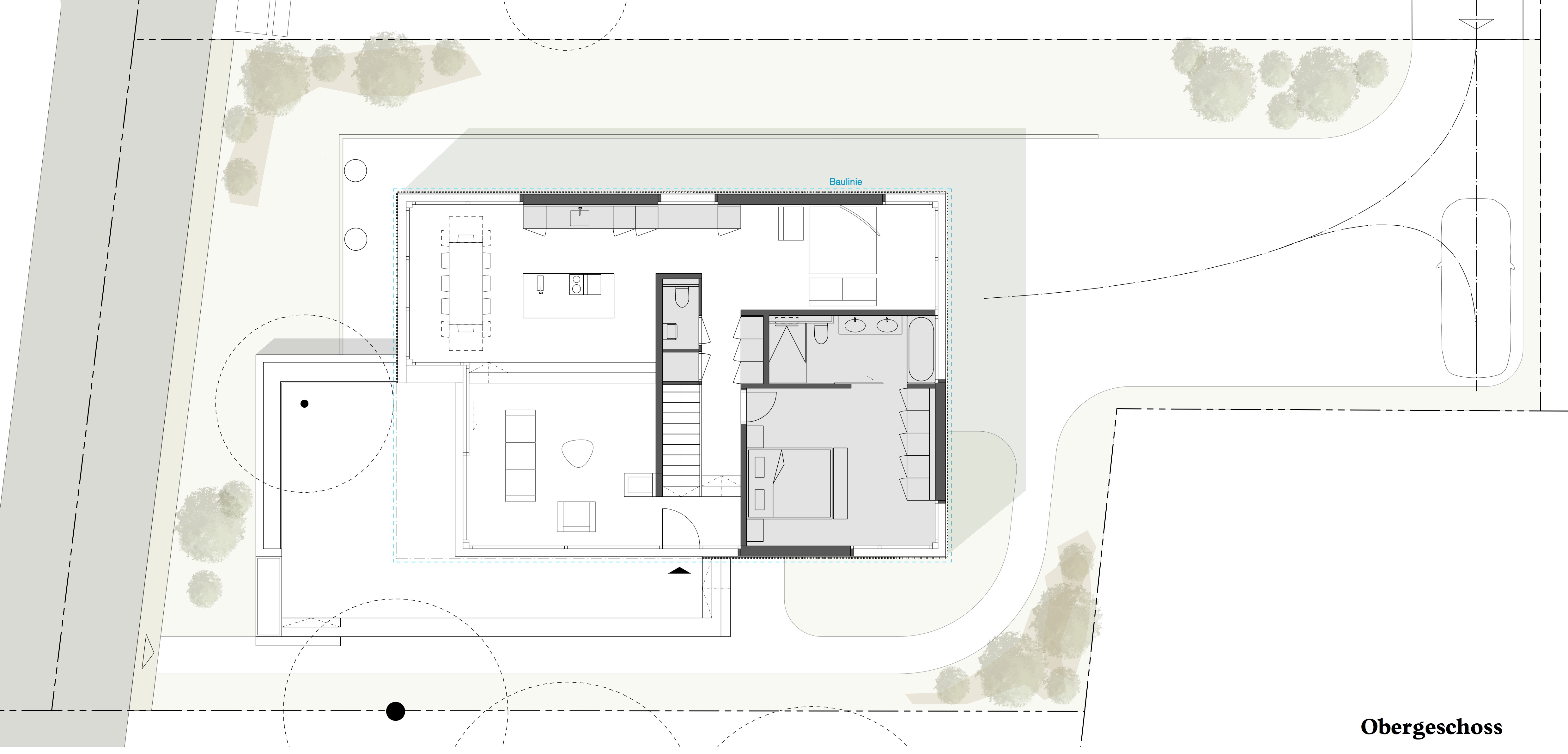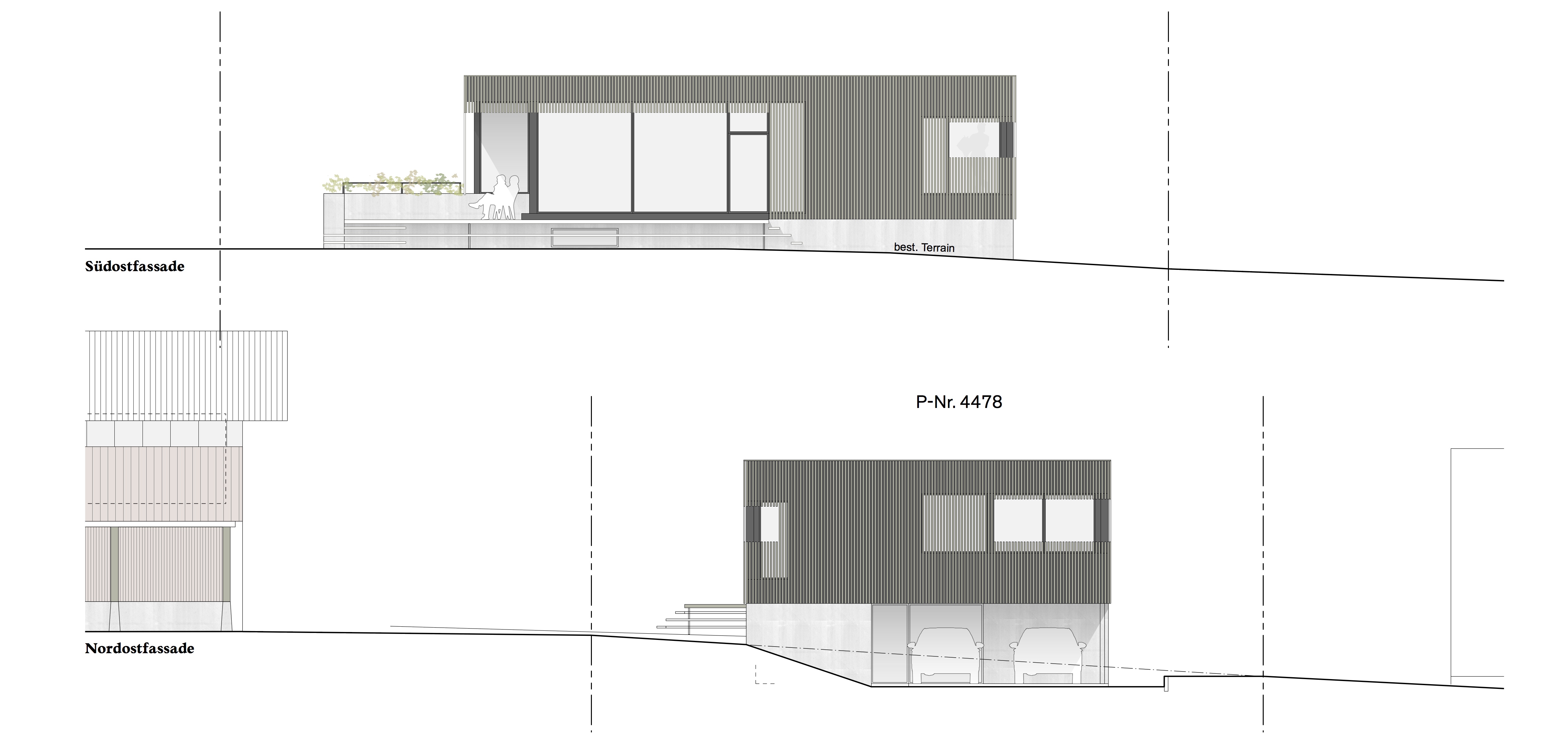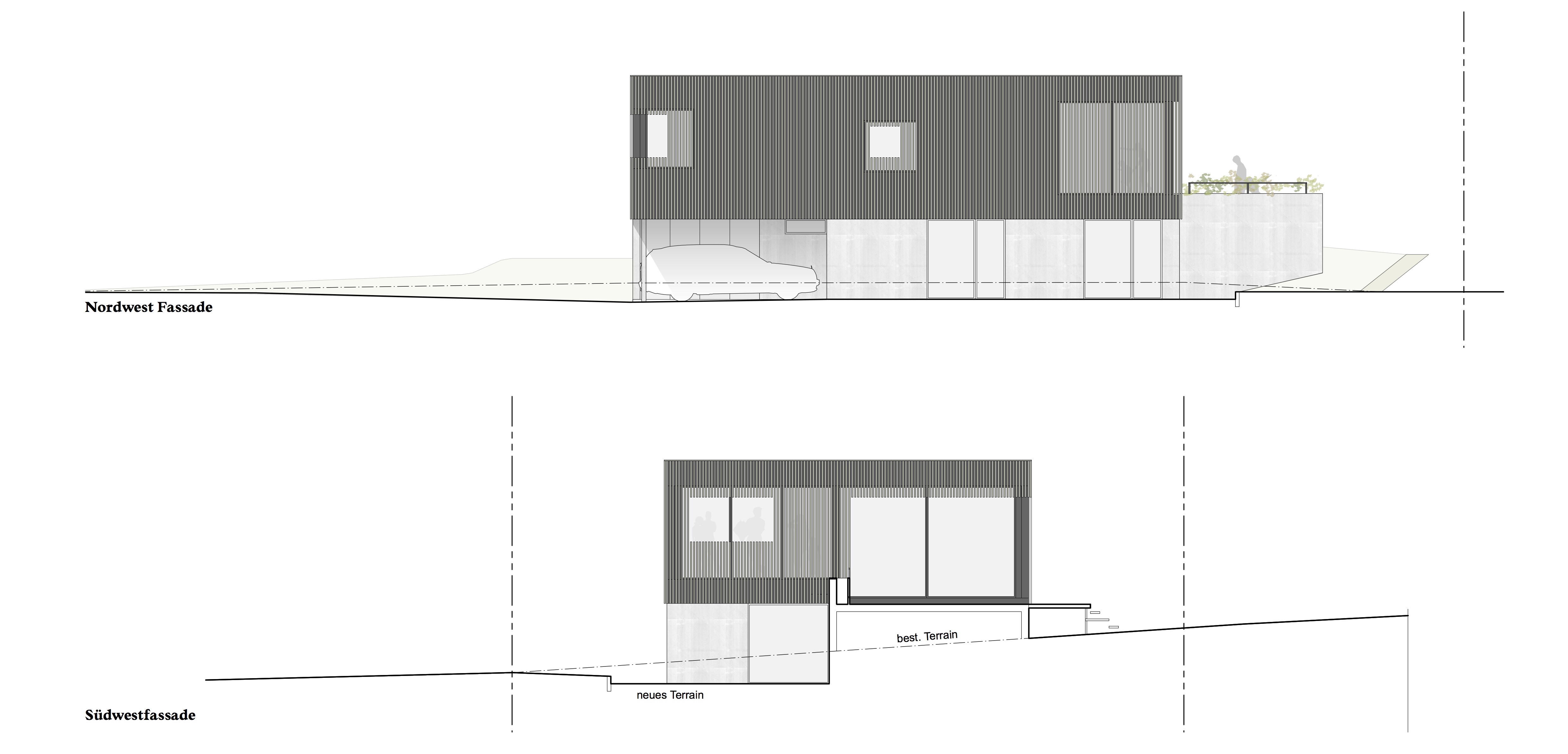 Für ein junges Paar projektiert Dost ein Einfamilienhaus im Quartier Ober-Kapf, Emmen. Das Grundstück befindet sich neben einem historischen Herrschaftshaus und besticht qualitativ durch Aussicht, Begrünung und Topografie. Diese Qualitäten sind, kombiniert mit den Wünschen der Bauherren, sensibel in den Entwurf eingeflossen. Die Holzfassade verkleidet das Obergeschoss und schafft durch ihre abwechselnde Transparenz und Undurchsichtigkeit variable Raumgefühle.