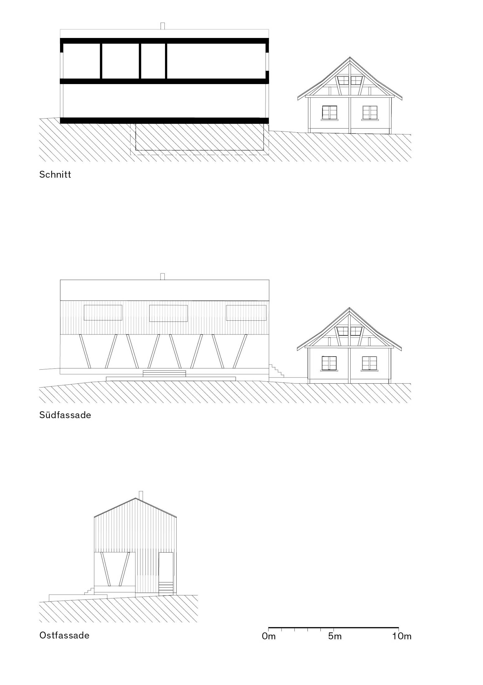 Die differenzierte Ausformulierung der Geschosse kommuniziert die Nutzerbedürfnisse und eine klare architektonische Haltung an die Umgebung: während das Erdgeschoss durch seine Holzskelettkonstruktion die Grenzen zwischen Wohn- und Freiraum aufzulösen scheint, erfährt man das Obergeschoss als geschlossenen und damit der Privatheit gewidmeten Körper. Wesentlichstes Element ist Holz, das Anwendung als Konstruktions- wie auch als Fassadenmaterial findet. Den filigranen Sockel bildet ein Fachwerk mit Glasausfachung, über dem sich das geschlossene, in Elementbauweise her- gestellte Obergeschoss erhebt. Die Gebäudehülle zeigt sich kontrastreich durch eine helle, vorverwitterte vertikale Holzlattung auf dem schwarzen Windpapier. Die schwarzen Biberschwanzziegel führen die äussere Erscheinung des dunklen Baukörpers zu einem schlüssigen Ganzen fort. Der hier erstellte Holzbau übertrifft gängige energetische Standards und bewerkstelligt durch seinen diffusionsoffenen Charakter ein gesundes Wohnklima. Heizung und Warmwasser werden über eine, zentral im Wohnraum angeordnete, Stückholzfeuerung erzeugt. Mit dieser Urform der Wärmequelle entstehen unterschiedliche Klimazonen. Dem Bauherrn, Eigentümer eines kleinen Waldstücks, wird dessen Bewirtschaftung für die eigene Nutzung ermöglicht. Der Bedarf an Elektrizität wird über die Photovoltaikanlage auf dem Dach gedeckt. Dieses energetisch autarke und im Flächenverbrauch genügsame Gebäude zeigt einen möglichen Weg für eine erfolgreiche Kombination von zeitgenössischem und nachhaltigen Wohnen im historischen Kontext auf.